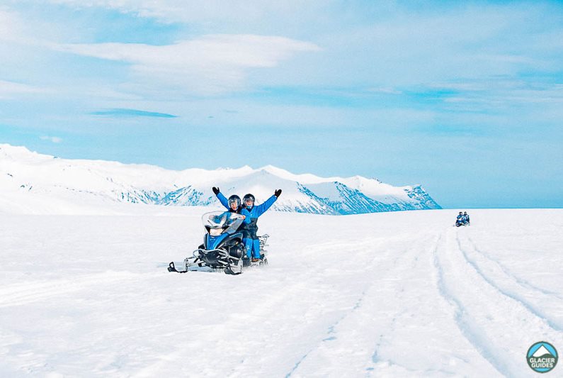 If you’re traveling solo but don’t have a valid driving license, you can book a guide to drive your snowmobile for an extra fee.